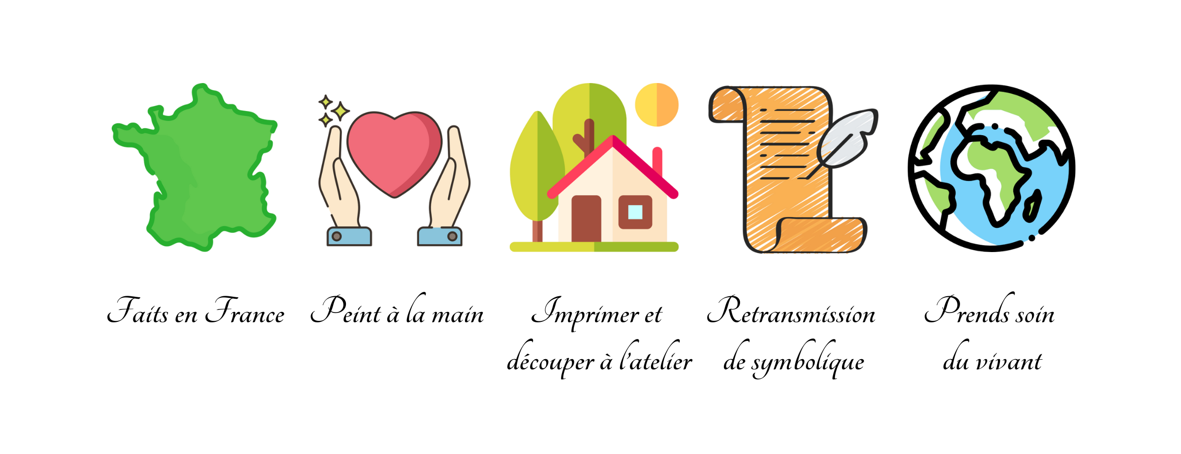 Je crée mes illustrations entièrement à la main, directement depuis mon atelier à domicile. Chaque dessin est imaginé et peint par mes soins (pas par une intelligence artificielle), ce qui donne à chaque création ses irrégularités, ses nuances et son charme unique. Les illustrations sont ensuite imprimées et découpées avec soin, grâce à une imprimante à réservoir d’encre et une machine de découpe, afin de limiter les déchets et d’assurer une qualité optimale.